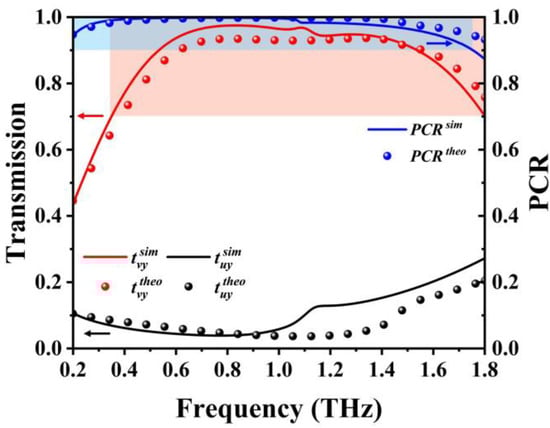 Figure 7 shows the transmission amplitude and PCR that contain both simulation results and theoretical results after the transformation of the coordinate system. These results indicate that most y-polarized terahertz waves were rotated into polarized waves parallel to the v-axis, which is in reasonable agreement with theoretically calculated results. The simulated PCR remained above 0.9, within the frequency range of the blue region in Figure 7, and the 45-degree linear polarized transmission tvy remained above 0.7, within the frequency range of the red region. The operating frequency range of the proposed structure with good performance is the intersection of the red and blue regions, ranging from 0.35 to 1.75 THz, with the relative bandwidth reaching about 133.3%. Therefore, the proposed device can achieve a high linear polarization conversion efficiency over a wide operating bandwidth.
