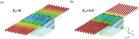 Figure 1 shows the two working states of the reconfigurable polarization rotator. In order to achieve the tunable function of the polarization state, the polarization rotator’s slanted grating material was made of graphene. As shown in Figure 1a, when the graphene grating was in the off-state and the Fermi level of the graphene was located at the Dirac point, the incident terahertz wave was less affected by the graphene grating in the working frequency band. The on-state of the graphene grating is shown in Figure 1b, where the Fermi level of the graphene was shifted away from the Dirac point by applying a gate voltage, resulting in a change in the anisotropic graphene grating that caused the y-polarized waves to pass through the metal grating with a 45° polarization rotation [26].