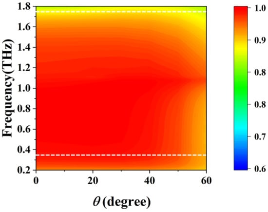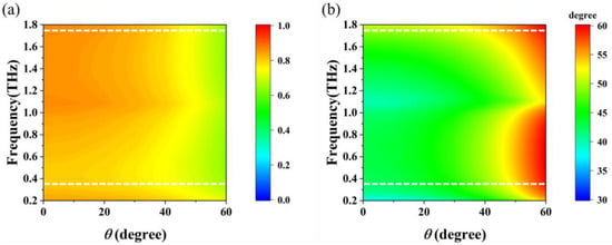Terahertz waves encounter oblique incidence more frequently than perpendicular incidence; hence, the insensitivity of the reconfigurable polarization rotator to oblique incidence is also an essential indicator. Figure 10a shows the amplitude of transmitted y-polarized waves as the incident angle varied in the xoz plane, while the graphene grating was in the off-state with y-polarized incidence. When the incident angle was less than 50 degrees, the off-state structure exhibited a high transmittance above 0.7 for y-polarized waves with a frequency range of 0.3–1.75 THz, which is marked with the white-dotted line. When the graphene grating was loaded with a bias voltage, the polarization conversion angle α with different incident angles is shown in Figure 10b. In the on-state of the proposed polarization rotator with EF = 1 eV, as the incident angle θ varied, the polarization rotation angle remained at approximately 45° until the incident angle θ reached 50°, and the linear polarization characteristics remained stable in the working frequency band. When the incident angle θ was greater than 50°, the polarization rotation angle increased to 60°, which no longer met the design goal of the polarization rotator. The PCR in Figure 11 remained high when the incidence angle θ was less than 50° in the working band. Considering the periods of the metal and graphene gratings were 8 μm and 5.6 μm, respectively, which are about 0.028λ0 and 0.0196λ0, respectively, and much smaller (almost by two orders of magnitude) than the central working wavelength λ0 of incident terahertz radiation, the reconfigurable polarization rotator had better oblique incidence insensitivity over a relatively wide bandwidth.