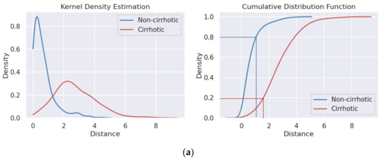 Figure 7a shows the KDE and CDF of a cirrhosis diagnosis; it shows the LSD value distributions under noncirrhotic (S0–S3) and cirrhotic (S4) cases. The average and two representative quantiles of LSD values from the CDF were extracted and are shown in Table 3. First of all, the average of the LSD value in cirrhotic cases was 2.74, which is much larger than that of noncirrhotic cases, 0.67. The 80% quantile of noncirrhotic cases was 0.98, which means that 80% of noncirrhotic cases had LSD values smaller than 0.98. Meanwhile, for cirrhotic cases, the 20% quantile of 1.67 shows that 80% of cirrhotic cases had LSD values larger than 1.67. From the LSD values’ distribution, we concluded that the difference between the liver and spleen was positively correlated with the degree of LF. Furthermore, the same conclusion can be reached from the analysis between mild-fibrosis (S0–S2) and advanced fibrosis (S3) as shown in Figure 7b.