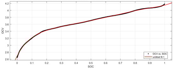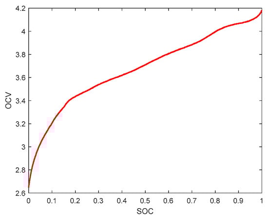 It was demonstrated that the open circuit voltage and SOC have the same trend and show specific correspondence with the SOC values [21]. After the OCV-SOC fitting relationship is established, can be obtained from the SOC predicted by the AEKF algorithm, and then, used for model parameter identification. In this paper, experiments were conducted with LiMn2O4 lithium batteries with a rated capacity of 35 Ah, a charging cutoff voltage of 4.2 V, a discharging cutoff voltage of 2.6 V, and a rated voltage of 3.7 V. The OCV-SOC curves were obtained as shown in Figure 2. The authors of [39] investigated the effects of temperature, data points, and aging degree when obtaining the OCV-SOC relationship for Li-ion batteries, and when 11 data points were selected to model the OCV-SOC relationship in the OCV test data, the highest power of the polynomial fit function should not exceed an order of 10. When the highest power of the polynomial is larger, an overfitting phenomenon will occur; when the highest power of the polynomial is smaller, an underfitting phenomenon will occur, so the polynomial with the highest power of seven is selected as the fitting function under comprehensive consideration. The fitting results are shown in Figure 3.