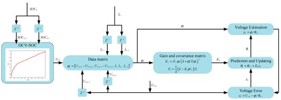 In the field of system identification, recursive least squares (RLS) has been widely used because of its advantages such as ease of understanding, good convergence effect, and fast speed [13]. However, RLS has the problems of data saturation and data accumulation, which affect the accuracy of current parameter identification; the introduction of forgetting factors can effectively prevent data saturation and enhance the accuracy of identification with new data [40]. The specific formula of the forgetting factor recursive least squares method is derived from [40], and the detailed flow of the algorithm is shown in Figure 4.