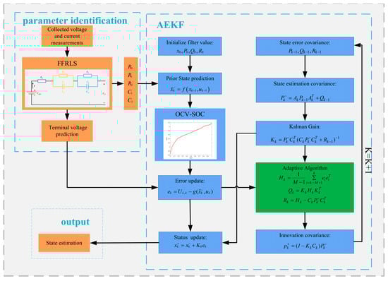 where is the dimension of the observation, which is the window size, and is a weighted average of the previous new interest variance; is the new interest matrix, which is the difference between the estimated voltage and the measured voltage; is the new interest covariance matrix; is the error covariance matrix; and is the Kalman gain. A flow chart of the AEKF-based algorithm is shown in Figure 5.