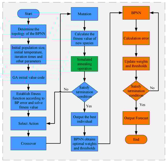 If the fitness value of the optimal individual in the new population is lower than that of the old individual, the individual is accepted as the new optimal value; otherwise, the acceptance probability of the new individual is calculated according to the formula, while a random number between 0 and 1 is generated, and if the acceptance probability of the new individual is greater than the random number, the new individual is accepted; otherwise, it is not accepted. At the end of each genetic operation, annealing is required. , is the initial temperature, is the annealing coefficient, and . When the algorithm starts, is larger and the GA is more likely to accept the inferior solution in the new population. The value gradually decreases with the increase in population generations, and the probability of accepting the inferior new solution becomes lower and lower, and when the value of tends to 0, it basically no longer accepts any deteriorating new solutions, and can only accept a new solution with a state lower than the current solution; thus, this is the key to preventing the GA from prematurely maturing and jumping out of the local extremes. A flow chart of the improved genetic algorithm for optimizing the BPNN is shown in Figure 7.