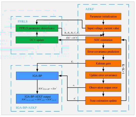From the figure, we can see that the whole prediction model is divided into three parts: parameter identification, AEKF prediction of SOC, and IGA-BP compensation.