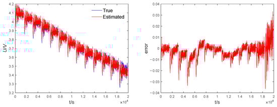 In the model identification effect validation experiments, the FFRLS algorithm is used to estimate the end voltage values using the data collected in the laboratory. Figure 11(left) shows the comparison between the estimated end voltage based on FFRLS and the measured voltage under the second-order RC equivalent circuit model. The estimated voltage basically matches with the measured voltage, which verifies that the second-order equivalent model has high stability and that the FFELS identification effect is good. Figure 11(right) shows that the voltage estimation error tends to increase gradually as the charging and discharging proceeds, which is caused by the more intense internal chemical reaction that occurs when the lithium battery is discharged to the cutoff voltage state, and the maximum absolute value of the end voltage error based on the FFRLS algorithm is calculated to be 0.035. The results show that the FFRLS can identify the model parameters well under the second-order RC model for subsequent SOC estimation use.