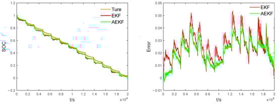 Comparison of the estimated SOC of EKF and AEKF. Left: SOC comparison results, right: comparison of estimation errors of SOC.