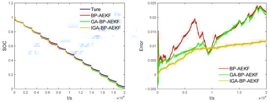 The SOC estimation results of the proposed joint algorithm and the unimproved algorithm were compared with all initial values being equal, and the experimental results are shown in figure. From Figure 13(left), it can be seen that the prediction trends of the three algorithms are basically consistent with the true values, but the SOC curve fit of the IGA-BP-AEKF algorithm is closer to the reference value, reflecting its strong tracking ability. From Figure 13(right), we can see that the maximum error of AEKF is significantly reduced after the BPNN compensation, and the BPNN compensation of AEKF after IGA optimization has the best effect. In the SOC < 0.5 stage, unlike the other two algorithms, the IGA-BP-AEKF model does not have a large abrupt change at a certain moment, indicating that IGA enhances the global optimization-seeking ability in the genetic process, has more advantages in searching the optimal initial parameters of BPNN, and has strong anti-interference ability, which is consistent with the performance of the error curve. From Table 2, we know that IGA-BP-AEKF has the smallest data values under all three evaluation criteria, which indicates that the improved joint algorithm has better stability in estimating SOC.