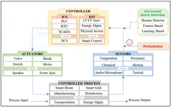 In order to consider the ML and DL-based mechanisms for cyber-attack detection in CPS, there is also a need to assess the security of these learning models. Specifically, it can be said that these learning models are also vulnerable to many types of adversarial attacks including poisonous attacks, evasion attacks, and exploratory attacks. Generally, the performance of these models depends on the training data, testing data, and the model itself, including its structure, so any sort of modification or deviation to the training data or testing data, or model structure, could result in malfunctioning of the model performance. For a general CPS, the data sources are surveillance sensors, textual data, or audio data, and the same is used to feed the learning model for training and testing purposes either in online or offline mode []. Modifications or perturbations to these data result in poisonous attacks and evasion attacks which occur at the training and testing phase of the model, respectively [,]. Model training is intended to learn the patterns of data and the testing is intended to evaluate the performance of the trained model on a similar set of patterns. Other than human intervention machines or external accessibility options, and repositories for storage, a CPS is generally composed of a closed-loop system containing the controlled process to automate [], various sensors, controllers, and actuators, as shown in Figure 1 []. A controlled process can be any application area of CPS wherein the motive is to automate the process. For instance, in a hydro-power plant, the motive can be the automation of power generation, and for the same, various types of sensors can be used to measure different aspects, including a temperature sensor, pressure sensor, flow sensor, level sensor, and voltage sensor, to name a few. The sensor data are fed to the controller so as to invoke actuation as and when required. For instance, to stop the power generation, the controller can turn the valve off to stop the water flow towards the turbine. The data collected by various sensors can also be fed to an ML model to learn data patterns and take some intelligent decisions. The data flowing from sensors to the controller, though, can be perturbed by an adversary, which could result in performance degradation of the ML model []. In some simple scenarios, the human detectors or built-in mechanisms can notice the perturbations, but in complex scenarios, such as in the case of GAN-based perturbations [], these mechanisms fail to detect the perturbations. Moreover, feature analysis-based and learning-based detectors can also be used as adversarial attack detection mechanisms. The other defensive mechanisms include data distortion, data decomposition-based methods on input data (i.e., data generated by sensors), and back-end mechanisms through structure and training enhancements [].