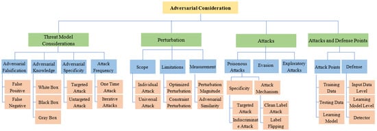 Machine learning and deep learning models possess the capability to ensure the security of Cyber-Physical Systems (CPS) []. This can be witnessed from the intelligent intrusion detection systems (IDS) based on various learning models including Naïve Bayes (NB), Decision Tree (DT), Support Vector Machine (SVM), Random Forest (RF), Deep Belief Network, Artificial Neural Network (ANN), and Long Short-Term Memory, to name a few [,,]. Rosenberg et al. [] in their work have analyzed that the learning models being utilized in the cyber security domain are also vulnerable to adversarial attacks. These learning models are also vulnerable to adversarial attacks, though, which are possible both at the training and testing phases and can arise because of the model itself or the dataset being fed to the model. Jadidi et al. [] have assessed the security of machine learning-based anomaly detection in CPS and for the same, they have utilized Bot–IoT and Modbus IoT datasets. Moreover, they have generated adversarial samples through the Fast Gradient Sign Method (FGSM) and tested the effectiveness of the ANN-based learning model on original and adversarial datasets. Based on these adversarial impacts on learning-based security methods in CPS, we have prepared a taxonomy of adversarial consideration, as in Figure 2, depicting the threat model aspects, perturbation scope, perturbation measurement, types of attacks, and attack and defense points. The adversarial attacks have been primarily categorized into poisonous attacks, evasion attacks, and exploratory attacks. The poisonous attacks and evasion attacks are triggered at the training and testing phase, respectively, by perturbing or modifying their respective training and testing data subsets [,]. Considering the mechanisms of adversarial exploitation in machine learning, there can be specialized threat models to deal with adversarial threats. This may include the artifacts which are usually not considered in a general threat model, which include attacking frequency, adversarial knowledge about the learning model or training and testing data, adversarial specificity, and adversarial falsification, to name a few [,,]. In addition, there can be perturbations of diversified scope and utilizing different perturbation measurement mechanisms. Data poisoning attacks are performed during the training phase which include the inclusion of adversarial data to the training dataset by performing perturbations like tiny perturbation or universal perturbation [], utilizing Generative Adversarial Networks (GAN) for adversarial data generation [], utilizing active learning-based approaches []. These attacks intend to either perform data perturbations to misclassify the input data samples or modify the output class itself to disturb the learning, which leads to performance degradation of the model.