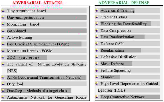 There are various defense mechanisms to deal with adversarial attacks. Some methods are based on the modification of data which includes Adversarial Training [,], Gradient Hiding [], Data Compression [], Blocking the Transferability [], and Data Randomization []. Another category of adversarial defense mechanism alters the model itself to defend against adversaries. This model-based modification defense mechanism includes Defensive Distillation [], Regularization [], Feature Squeezing [], Mask Defense [], and Deep Contractive Network []. The third category of adversarial defense methods utilizes auxiliary tools to defend against adversaries. This category of defense includes MagNet [], Defense-GAN [], and High-Level Representation Guided Denoiser (HGD) []. Adversarial training or adversarial learning is a widely used approach in which the model is retrained so as to either correctly learn the classification of adversarial samples or create a separate class for adversarial samples. This method performs better defense in situations where all the possible adversarial samples are known []. For unforeseen adversarial samples, it has the least effectiveness. Various types of adversarial attack and defense methods have been depicted in Figure 3.