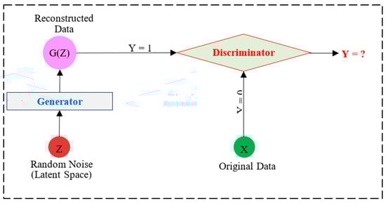 A Generative Adversarial Network (GAN) is a deep learning-based model used to generate data. It is often used to generate data samples based on specific data entries. The GAN network has two core components, i.e., Generator (G) and Discriminator (D), as shown in Figure 4. Initially, the Generator is intended to generate a random data sample or tuple based on latent space or random noise. The generated data sample is fed to the Discriminator model which identifies the label Y of the data sample. If the Discriminator correctly identifies that the data sample is a generated sample, i.e., Y = 1, the sample is regenerated by the Generator model. The process continues until the Generator model fools the Discriminator model, i.e., label Y = 0 for each data sample generated.