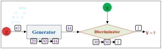 As per the GAN structure, it requires two core models to perform adversarial data generation. These models are Generator (G) and Discriminator (D). Based on these facts, we implemented a GAN network with a Generator and Discriminator structure as shown in Figure 5. We implemented a four-layered Generator and Discriminator model. The structure of G is such that its output layer size is equal to the number of attributes in the original dataset and its input size is taken as 45, which is the attribute size of latent space. Overall, the structure of the Generator is , and the structure of the Discriminator is . The size of the Discriminator’s output layer is 1, which is because it has to represent only two values, i.e., Y = 0 (normal sample), and Y = 1 (attack sample). These two values of Y can be represented by a single neuron as well. The ‘relu’ is used as an activation function in all the layers of the Generator model except for the output layer that uses the ‘linear’ activation function. In the case of the Discriminator model, ‘relu’ is used as an activation function in all the layers except for the output layer, where ‘sigmoid’ is used as an activation function. Moreover, we used ‘adam’ as an optimizer in our GAN model. Overall, the structure of GAN (containing Generator and Discriminator) is hard coded in our case for adversarial data generation. We encourage readers to make use of hyper-parameter optimization (HPO) to define the structure of GAN, and other ML models.