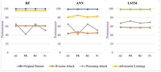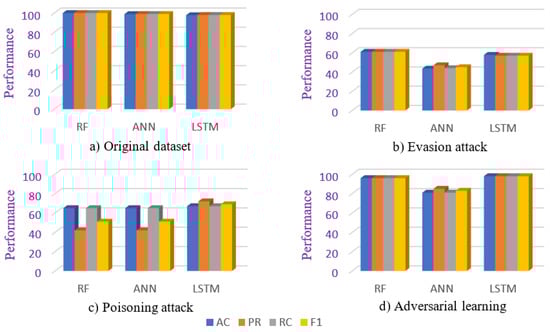 The results reveal that the evasion and poisoning-based adversarial attacks severely degrade the performance of learning models in the CPS security domain as shown in Figure 8. Each of the selected learning models showed low performance against GAN-based adversarial attacks. The RF model has been more severely impacted by data poisoning attacks than evasion attacks, whereas the ANN and LSTM models have been more severely impacted by evasion attacks than data poisoning attacks. In an original TON_IOT dataset, all three selected learning models resulted in performances of more than 95% for accuracy, precision, recall, and f1 score, but in comparison to this baseline performance, the performance during the evasion attack and the data poisoning attack invoked big downshifts with regard to the same performance matrices. Out of the possible mechanism to deal with adversarial impacts or build robust learning models for the security of CPS, we considered the adversarial learning-based strategy to learn the adversarial patterns. The use of adversarial learning enhanced the performance of learning models against adversaries and the same can be witnessed in Figure 8. Through this approach, all three selected learning models performed better against adversarial attacks. More specifically, RF and LSTM achieved performances of 96% and 98%, respectively, whereas ANN achieved accuracy, precision, recall, and f1 score of 81%, 85%, 81%, and 83%, respectively. This indicates that the LSTM model performed much better than RF and ANN through an adversarial learning strategy and its performance against adversarial attacks was equivalent to its original baseline performance.