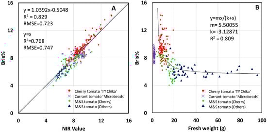 (A) NIR value versus Brix% of all tomato categories shown in Table 1. A dotted line shows a regression line, and a straight line shows y = x, where y is the refractometer-based Brix% (Brix%) and x is the NIR-derived Brix% value (NIR value). RMSE was 0.723 Brix% for the linear regression line and 0.747 Brix% for y = x. (B) Fresh weight versus the refractometer-based Brix% of all tomato categories. A dotted line shows a hyperbolic curve fit of samples except for ‘Microbeads’.