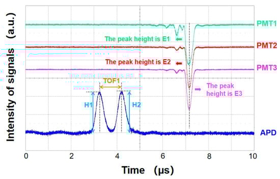 A digital oscilloscope (WaveRunner104Xi-A, LeCroy (Chestnut Ridge, NY, USA)) was used to display and store the amplified signal from the APD and PMTs for later data processing. The sampling interval of the oscilloscope was set to 1 ns. The typical signals of a single oleic acid particle displayed on the oscilloscope are shown in Figure 2. As previously mentioned, TOF1 is the time-of-flight of the particle passing through two separate orthogonally polarized beams (usually a few hundred nanoseconds to a few microseconds), and proportional to the aerodynamic diameter. H1 and H2 correspond to the peak values of the bimodal signal produced by APD when particles pass through horizontally polarized incident light and vertically polarized incident light, respectively. E1, E2, and E3 correspond to the peak values of the single-peak signals produced by the three PMT when the particles pass through the laser with a wavelength of 405 nm, respectively.