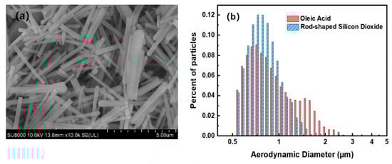 Two aerosol samples with different shapes were studied experimentally, including Oleic acid particles and rod-shaped Silicon dioxide particles. Since it is difficult to obtain rod-like aerosol samples, so we synthesized rod-shaped Silicon dioxide particles by ourselves using the reversed-phase microemulsion method [], and the scanning electron microscope (SEM) image of the sample is shown in Figure 4a. It can be seen that almost all the synthesized Silicon dioxide particles are rod-shaped. Oleic acid particles cannot be photographed by electron microscope because of their properties, but according to relevant literature, the shape of Oleic acid particles is considered spherical [,]. Both Oleic acid and Silicon dioxide have a refractive index of 1.46 [,]. The size distribution of the four aerosol particles was measured by Aerodynamic Particle Sizer Spectrometer (APS3321), respectively. To better compare the size distribution of different aerosol particles, the frequency distribution diagram of the particle size distribution of each sample was drawn, and the results are shown in Figure 4b. As can be seen from Figure 4b, the aerodynamic particle diameter Da of two aerosol particles both within 4 μm, and the size distribution of Oleic acid particles is slightly wider than that of rod-shaped Silicon dioxide particles.