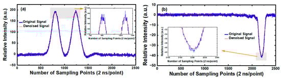 Due to the influence of light and electrical noise during the experiment, the shape of the real spectral signal will be distorted, and the signal-to-noise ratio will be decreased. Therefore, in the processing of spectral signals, noise reduction is often needed. Wavelet soft threshold denoising method was applied to preprocess the scattered light signals detected by APD and PMTs, respectively. Taking Oleic acid particles as an example, Figure 5 shows the comparison results between the original spectral signals of Oleic acid particles output by APD and PMTs and their corresponding signals after noise reduction. Figure 5a is the spectral signal corresponding to the APD, and Figure 5b is the spectral signal corresponding to the PMT. The blue solid line in the figure represents the original spectral signal before denoising, while the red solid line represents the spectral signal after denoising. It can be seen that, compared with the original spectral signal, the noise level of the spectral signals after denoising is obviously reduced, and the smoothness of the signals is significantly improved.