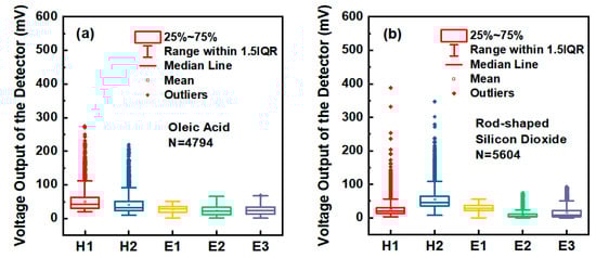 The intensity distribution of scattered light of each sample measured by APD and PMTs in the experiment is shown in Figure 6. The abscissa in the figure represents scattered light signals received by each detector during the light-scattering process of individual particles, and the ordinate represents the output voltage of the oscilloscope corresponding to each signal. Figure 6a,b represents Oleic acid aerosol particles, and rod-shaped Silicon dioxide aerosol particles, respectively. As can be seen from Figure 6, the intensity distribution range of scattered light received by the PMTs corresponding to thousands of (N = 4794) Oleic acid particles is basically the same, and the intensity distribution of the two peaks of the double-crested signal received by the APD is similar as well, but the intensity of H2 is slightly less than H1 on the whole. However, for thousands of (N = 5604) rod-shaped Silicon dioxide particles, the intensity distribution of the scattered light received by each detector is obviously different from that of the Oleic acid particles, in which the intensity of H2 is significantly higher than that of H1, and the intensity of E1 is significantly higher than that of E2 and E3, indicating that the intensity of scattered light from aerosol particles with different shapes received by each photoelectric detector has different distribution characteristics.