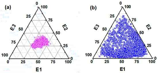 To avoid the influence of the difference in the photoelectric conversion efficiency of the three PMTs on the measured results of the intensity of scattered light, spherical Oleic acid particles were used to modify the response intensity of each PMT. Figure 7 shows the relative magnitude of scattered light intensity E1, E2, and E3 of each aerosol particle in different spatial orientations after third-order polynomial correction. It can be seen that the Oleic acid aerosol particles in Figure 7a are concentrated in the central region of the ternary phase diagram, which indicates that the intensity of scattered light from an individual Oleic acid particle in three spatial directions is relatively close. The rod-shaped Silicon dioxide aerosol particles in Figure 7b tend to be distributed in the lower right corner of the ternary phase diagram, indicating that the intensity of scattered light of most rod-shaped Silicon dioxide particles at PMT1 position (corresponding horizontal direction in spatial orientation) is greater than that at PMT2 and PMT3 positions. The results also prove that the orientation of the rod-shaped particles tends to be parallel to the airflow in the injection flow, which is consistent with the conclusion of Hirst et al. [].