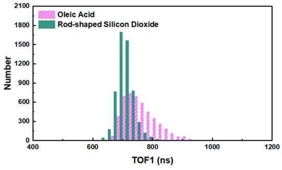 The distribution of time-of-flight of Oleic acid particles and rod-shaped Silicon dioxide particles.