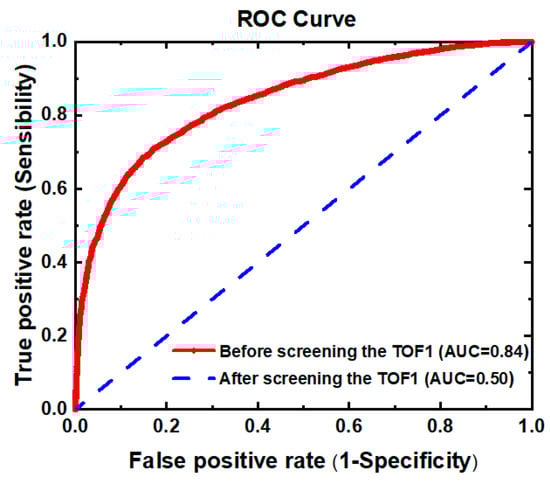 Since the distribution range of time-of-flight (corresponds to the size of the particle) of Oleic acid aerosol particles in the experiment is not completely consistent with that of rod-shaped Silicon dioxide aerosol particles (as shown in Figure 8), it is necessary to confirm whether the size of particles will affect the analysis and identification of the two kinds of aerosol particles. To evaluate the performance of the discrimination between Oleic acid aerosol particles and rod-shaped Silicon dioxide aerosol particles based on their time-of-flight, the receiver operating characteristic (ROC) curves were applied here to analyze the two kinds of particles, and the results are shown in Figure 9. ROC curve can be used to evaluate the performance of the classifier. Generally speaking, the closer the value of the area under the ROC curve (AUC) is to one, the better the classification effect of the method. It can be seen that the AUC corresponding to the red line in Figure 9 is 0.84, which indicates that the time-of-flight of the two kinds of aerosol particles has a certain ability to distinguish their categories. Therefore, to eliminate the influence of particle size on the classification of Oleic acid and rod-shaped Silicon dioxide particles and the intensity of their scattered light, we screened the spectral data to be analyzed according to their time-of-flight. The spectral data of the two kinds of aerosol particles which have the same TOF1 are selected and stored as matrix X0 and X1, respectively (both X0 and X1 are matrices of order 2335 × 6, and 2335 is the number of target particles screened out from the two samples, respectively). The ROC curve of Oleic acid particles and rod-shaped Silicon dioxide particles was drawn by taking the time-of-flight contained in the matrix X0 and X1 as the criterion, and the results are shown in the blue line in Figure 9. The value of AUC corresponding to the blue line in Figure 9 is 0.50, indicating that the aerosol particles of Oleic acid and rod-shaped Silicon dioxide could not be distinguished by TOF1 alone.