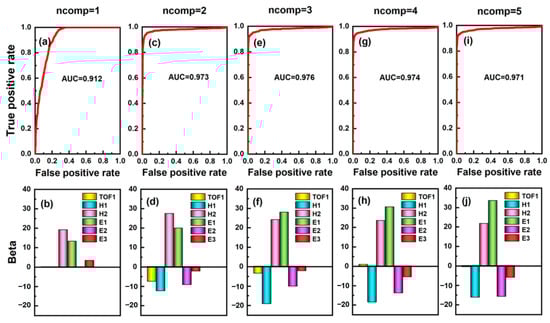 The results of the AUC of the classification model and the Beta coefficient correspond to the respective variables when PLS-DA extracted different number of principal components. (a,b) ncomp = 1. (c,d) ncomp = 2. (e,f) ncomp = 3. (g,h) ncomp = 4. (i,j) ncomp = 5.