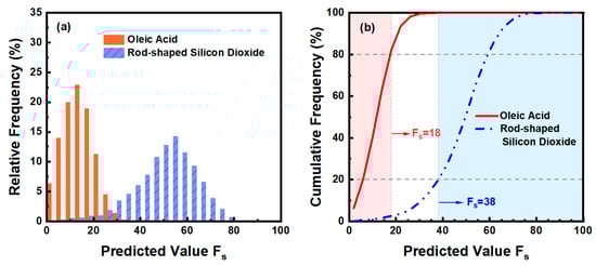 The distribution of Fs of Oleic acid aerosol particles and rod-shaped Silicon dioxide aerosol particles. (a) Relative frequency. (b) Cumulative frequency.
