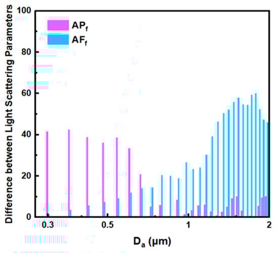 Taking spherical Oleic acid particles and ellipsoidal Silicon dioxide particles with an aspect ratio of 3:1 as examples, the difference in light scattering parameters of the two particles under different aerodynamic particle sizes was calculated by simulation and interpolation method (the orientation of the elongated particles was set parallel to the airflow direction), and the results are shown in Figure 12. It can be seen that at the smaller particle size range, the difference in APf between the two aerosol particles is large, while the difference in AFf is small. With the increase of aerodynamic particle size, the difference in AFf between the two aerosol particles increases gradually, while the difference in APf decreases significantly.