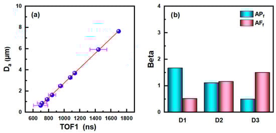 (a) Conversion relationship between time-of-flight of aerosol particles and aerodynamic diameter. (b) Beta coefficients of APf variable and AFf variable of the models in different particle size segments.