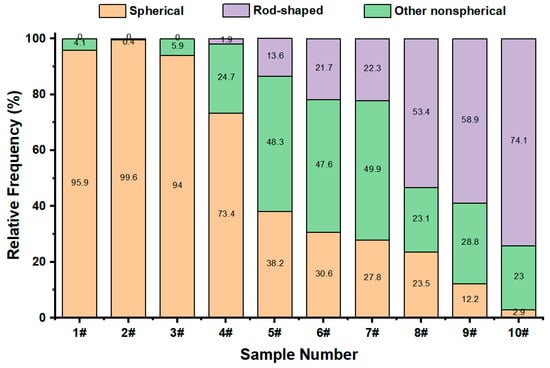 To verify the effectiveness of the discrimination method proposed in Section 3.4, a variety of aerosol samples with different shape characteristics were used for the classification test, and the results are shown in Figure 14. The abscissa in Figure 14 represents the corresponding numbers of various aerosol samples, while the ordinate represents the proportion of spherical particles, rod-shaped particles, and other non-spherical particles in various aerosol samples. Among them, samples 1# and 2# are monodisperse Oleic acid droplets with a median aerodynamic diameter of 2.18 μm and 3.22 μm, respectively. Sample 3# is monodisperse Ethanol droplets with a median aerodynamic diameter of 1.39 μm. Sample 4# is Silicon dioxide microspheres (Andi Metal Materials Co., Ltd., Hebei, China). Sample 5# is irregular Silicon dioxide particles (Chuangjia Welding Materials Co., Ltd., Hebei, China). Sample 6# is the collected coal ash sample. Samples 7# and 8# are two kinds of Silicon oxide powder materials (Ruilong Biotechnology Co., Ltd., Hebei, China). Sample 9# is Basic magnesium sulfate whiskers (Fengzhu Composite New Material Technology Co., Ltd., Shanghai, China). Sample 10# is self-synthesized rod-shaped Silicon dioxide particles.