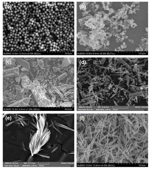 Electron microscope images of aerosol samples. (a) 4# Silicon dioxide microspheres. (b) 5# irregular Silicon dioxide particles. (c) 7# Silicon oxide powder materials. (d) 8# Silicon oxide powder materials. (e) 9# Basic magnesium sulfate whiskers. (f) 10# rod-shaped Silicon dioxide particles.