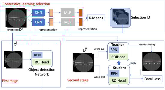 Semi-supervised object detection training with contrastive learning selection. The most informative images are first selected using a simCLR model with k-means clustering. Semi-supervised learning object detection includes a first stage (burn-in) with labeled data and a second stage with unlabeled data and a student–teacher mutual learning framework.