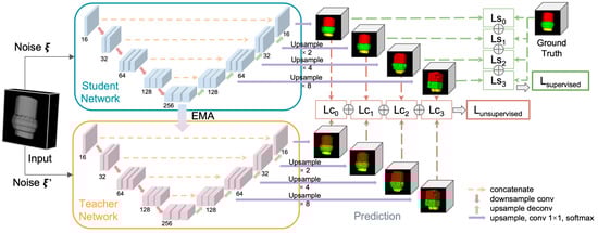 Following the spirit of Mean Teacher, many achievements have been made to further improve teacher–student training, such as enhanced shape-awareness [34]. In addition, various consistency-based methods are proposed to improve the semi-supervised performance, including uncertainty-aware consistency [35], transformation consistency [36], multi-task consistency [37], and multi-scale consistency [38]. Recent studies indicate that multi-scale consistency is a straightforward yet effective approach for enforcing consistency between different networks at various scales, achieving great success in many tasks [39,40]. Moreover, the feature maps of hidden layers in networks can be extracted to produce multi-scale predictions for deep supervision, improving the discrimination capability.
