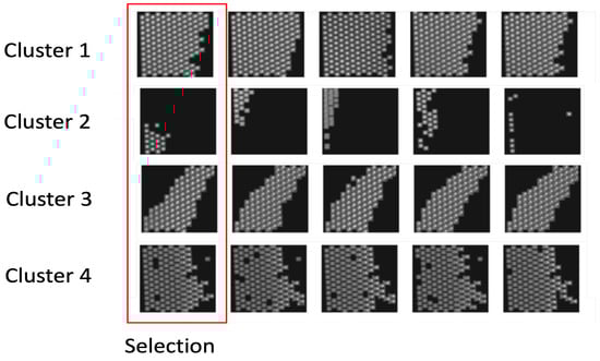 Results of image pre-selection from the contrastive learning method. The first image on the left shows the selection and the images in the same row show similar images assigned to the same cluster. We notice that the selected images are all different and represent different data features in the dataset.