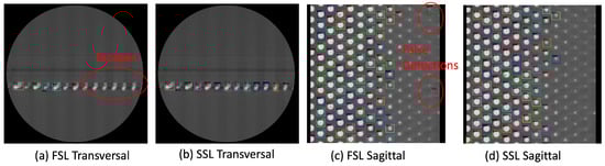 Given the specificity of the data and the low distribution, we notice that our SSL network performs well even with a very small amount of labeled data (). This demonstrates the reduced requirement for labeled data with our SSL framework. We also show the detection results on some slices for both sagittal and transversal views to highlight these differences in Figure 8. We observe more false detections on the FSL model compared to ours. The full implementation of the method includes three phases: the first phase detects the bumps on the individual slices, the second estimates the 3D bounding boxes in the scan, and finally, the third phase extracts the bump into individual files. Given the structure of the data and our processing scripts, all phases can be parallelized to reduce the processing time. Furthermore, our method with labeled data has a better detection accuracy than other methods with labeled data for both sagittal and transversal views for logic and memory bumps except for the transversal split for the unbiased teacher.