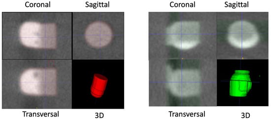 Examples of logic (left) and memory (right) bumps extracted from the 3D scans. Three views (transversal, sagittal, coronal) are shown with the 3D representation.