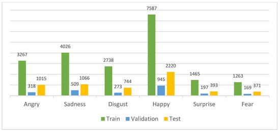 The CMU-MOSEI dataset is a large-scale, multimodal dataset for emotion analysis (Figure 7) in the context of conversational video data. The dataset contains more than 23,000 video clips from 1000 sessions with over 1200 participants. The video data is accompanied by speech transcripts, audio features, visual features, and labels indicating the valence and arousal levels. The CMU-MOSEI dataset comprises six emotion classes: anger, happiness, sadness, disgust, fear, and surprise. There are angry (4600), sadness (5601), disgust (3755), surprise (2055), happy (10752), and fear (1803) emotional samples. Similar to the division of the IEMOCAP dataset, we applied the same split to the CMU-MOSEI dataset (Figure 8). For the creation of training and validation sets, we allocated 70% and 10% of the data, amounting to 20,346 and 2411 samples, respectively. The remaining 20% of the data, comprising 5809 samples, was reserved specifically as the test set.