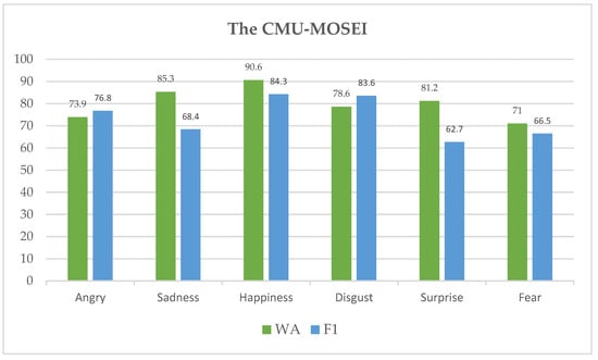 According to Figure 9, the suggested system achieved 90.6% accuracy in WA on the CMU-MOSEI dataset for the happy emotion. It also had excellent accuracies for sadness and surprise, with 85.3% and 81.2%, accordingly. The model performed poorly in identifying angry and fear classes, with 73.9% and 71.0% accuracy, respectively. On the other hand, the proposed approach had the highest F1 rates for the emotions of happiness and disgust, earning 84.3% and 83.3%, respectively. Both surprise and fear were rated lower by the model on the F1 scale, with scores of 76.8% and 66.5%, for instance.