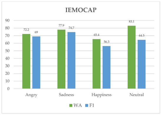 In the IEMOCAP dataset scenario, we can observe that the system performs inconsistently across distinct feelings. For instance, in Figure 10, when it comes to identifying the emotion “neutral”, WA has a score of 83.1, suggesting that it does an excellent job. The system also shows effective recognition of sadness with a pretty high WA score of 77.9. Moreover, the system displays a relatively high level of accuracy in recognizing sadness (74.7) and angry (69.0) emotions, as shown by its high F1 scores. However, for the emotions of neutral and happiness, the system’s F1 score is lower, with rates of 64.5 and 56.3, respectively. This suggests that the system may have more difficulty recognizing these emotions compared to the others.