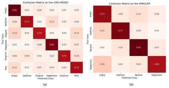 Confusion matrices on the (a) CMU-MOSEI and (b) IEMOCAP datasets.