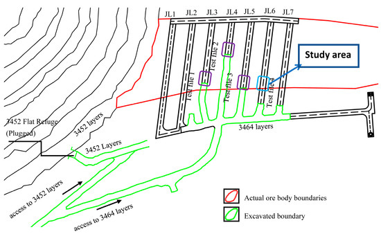 Its administrative jurisdiction belongs to Bayinguoleng Mongolian Autonomous Prefecture Hejing County. Since 27 September 2021, multiple vibration tests have been carried out in the mine. In this test, the No. 4 ore removal tunnel was selected, as shown in Figure 1, and vibration tests and analysis of fragmentation degree were conducted on the digital electronic detonators and nonel detonators during the excavation and blasting. It should be noted that the primary working conditions of the two different sets of detonators are nearly identical, including the target rock, the segmented blasting stages, the hole network parameters, the total amount of explosives used, the explosives used per borehole, the type of explosives, and the layout of monitoring points, as indicated in Figure 1. The purple boxed area in Figure 1 represents the current excavation locations of other tunnels, while the blue boxed area represents the test site for this experiment.