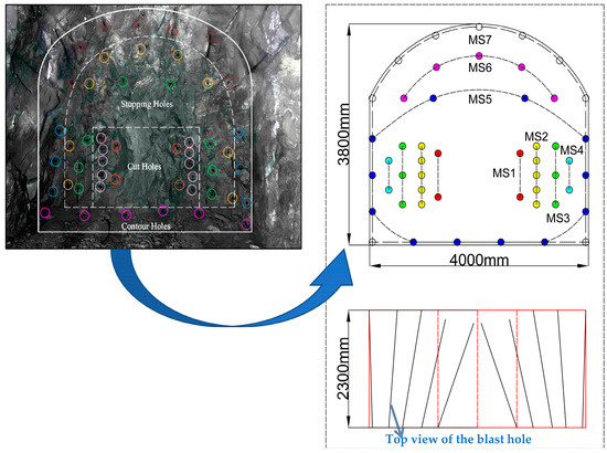 A double-wedge-shaped slotting method was used for the working face during the testing period. The measured average hole depth of the first round of slotting was 1.14 m, and that of the second round was 2.07 m. The auxiliary and peripheral holes were 2.2–2.3 m in depth, and the diameter of the blasting hole was 40 mm. The explosive used for this blasting was a bar-shaped emulsion explosive with dimension parameter Φ32 mm × 320 mm × 300 g (diameter × length × mass). The delay interval between digital electronic detonators is set at 150 ms for 7-segment blasting. We selected 1/2 s delay nonel detonators, and the selected segments were classified into the 1st, 2nd, 3rd, 4th, 5th, 6th, and 9th segments for segmented blasting, with simultaneous blasting of boreholes within the same segment. Fifty blasting holes were fired in each cycle (including 4 for the first round of slotting, 10 for the second round, 17 for the auxiliary holes, and 19 for the peripheral holes), consuming a total explosive mass of 66 kg. The maximum explosive consumption for a single blast segment is 16.2 kg, and the advance per cycle is about 2.1 m. The number of roll-packed emulsion explosives used for each section (MS1–MS7) was 12, 50, 30, 20, 54, 20, and 34, respectively. The blasting hole connection is shown in Figure 2, and the blasting sequence was conducted from left to right and from top to bottom, according to the legend in the figure. In Figure 2, solid circles of the same color represent boreholes detonated at the same time point.