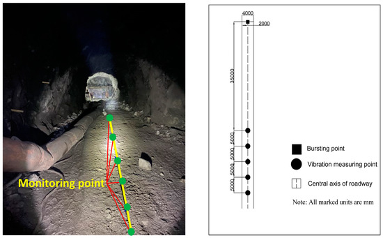 As shown in Figure 3, this study used a straight-hole layout method along the centerline of the roadway floor. The first monitoring point was 35 m from the face, and the distance between adjacent sensor intervals was 5 m. The number of instruments to be installed was determined according to the conditions of the test site, with no less than three instruments and no more than six instruments used for each monitoring. The X-axis of the sensor was aimed at the blast center.