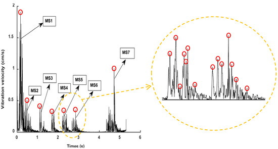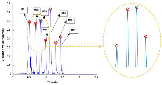 Furthermore, by comparing Figure 7 and Figure 9, it can be observed that the envelope signals of the vibration waves of the digital electronic detonator blasting were relatively smooth. In contrast, the nonel detonator showed abrupt changes in the waveform within each segment, with many harmonics present. Figure 9 shows that in the detailed display of the 5th and 6th segments of the nonel detonator, at least seven waveform peaks with different amplitudes were found, with time intervals ranging from 14 ms to 43 ms, with an average interval time of 25.8 ms. In addition, the decay time of the vibration waves of each segment of the electronic and nonel detonator was identified and calculated, and the average decay times were 0.1089 s and 0.4484 s, respectively. The vibration wave decay rate of the digital electronic detonator was approximately four times that of the nonel detonator, with all parameters other than the detonator used being the same. Therefore, based on the above-shown analysis, it can be further confirmed that the digital electronic detonator has high delay accuracy and can essentially achieve simultaneous blasting within each segment. In contrast, the nonel detonator has more significant delay time errors, which lead to the vibration waves of each borehole within each segment being randomly superimposed based on the delay time control. This causes a slower vibration wave decay rate and more random peak values in the waveform within each segment.