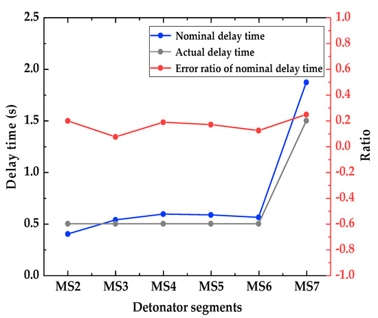 Figure 9 shows the envelope spectrum and detailed display of the IMF 2 component signal of the nonel detonator. Figure 10 shows the relationship curve between the nominal delay time, actual delay time, and error ratio. The nonel detonator used in this blasting project has a delay time of half a second, with a permissible delay error of ±150 ms. Analysis of Figure 8 identifies seven segments of the blasting waveform, with only the first and second segments being superimposed, while the other five segments are relatively independent. The time of each waveform peak was 0.1665 s, 0.5667 s, 1.104 s, 1.698 s, 2.283 s, 2.845 s, and 4.718 s. Figure 10 shows that the actual delay times of the nonel detonators in the first six segments of the blasting conduit were generally distributed around the nominal delay time, with delay errors ranging from 0.0746 to 0.2478. In the seventh segment, the ninth nonel detonator was used. However, since this segment spans three parts and the delay interval is calibrated at 1.5 s with a delay error ratio of 0.2487, the nominal and actual delay time errors differed significantly and, therefore, could not be used as a reference for subsequent calculations. Thus, the maximum positive delay time error of the nonel detonator was +94 ms, the maximum negative delay time error was −99.8 ms, and the average error was 75.6 ms with an accuracy of approximately 84.9%. It can be seen that the use of nonel detonators did not achieve simultaneous blasting within each segment due to its delay accuracy issues.