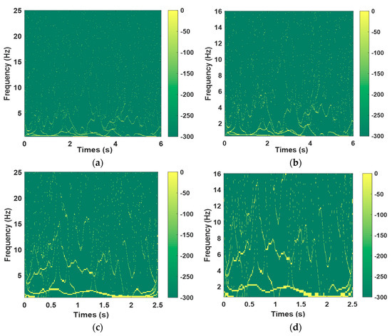 2D Hilbert spectra of vibration signals from digital electronic detonators and blasting conduit detonators: (a) 2D Hilbert energy spectrum of the digital electronic detonator within the frequency range of 0–25 Hz, (b) 2D Hilbert energy spectrum of the digital electronic detonator within the frequency range of 0–16 Hz, (c) 2D Hilbert energy spectrum of the nonel detonator within the frequency range of 0–25 Hz, and (d) 2D Hilbert energy spectrum of the nonel detonator within the frequency range of 0–16 Hz.