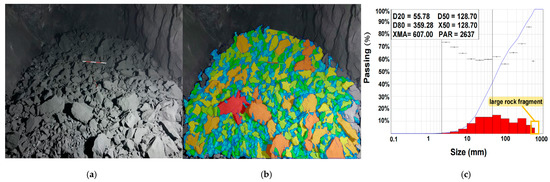 Digital electronic detonator blasting rock size analysis: (a) on-site shooting of blasting pile samples; (b) sample processing diagram; (c) WipFrag analysis chart.