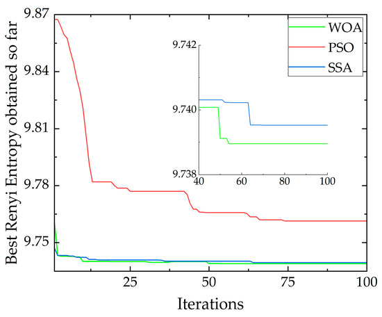 - A comparison was carried out between PSO, SSA and WOA to evaluate their performance during the optimization process. The number of iterations of WOA adopted in this paper decreased by 26% and 23%, respectively, compared with PSO and SSA, which means that the WOA performs faster in terms of convergence speed and has a more accurate Rényi entropy value;