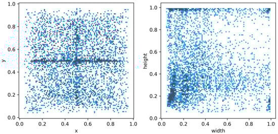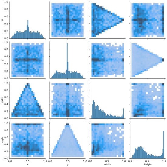 where width is the width of the image, and height is the height of the image. The pairwise relationship between the four attributes of , , width, and height is described. The diagonal line represents the histogram (distribution map) of each attribute, and the off-diagonal line represents the correlation between two different attributes. From Figure 6, it can be found that the center points of the target frame are mostly concentrated in the central area of the image. However, the width and height attributes are unevenly distributed, and there is a distribution at the maximum value, suggesting that there is a large-sized target box.